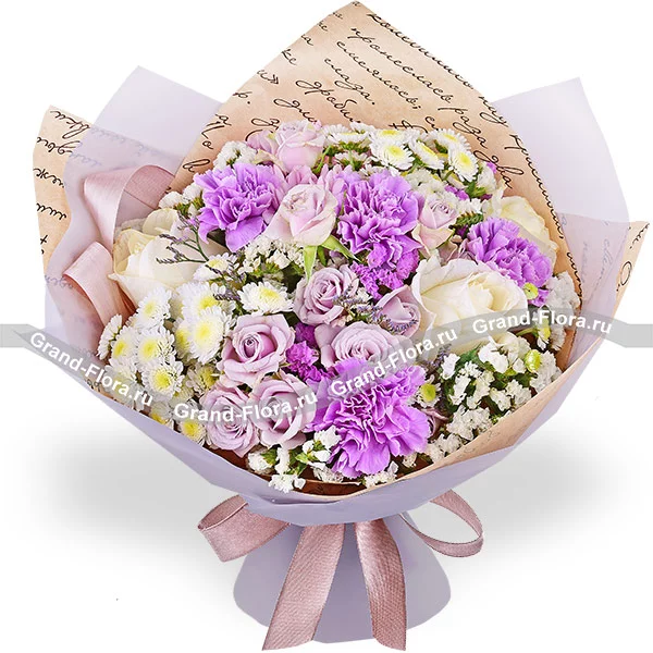 Стандартный: роза белая - 2 шт., роза кустовая фиолетовая - 1 шт., гвоздика фиолетовая - 2 шт., хризантема сантини - 2 шт., хризантема кустовая ромашковая фиолетовая - 2 шт., статица, упаковка, лента. Примерный размер: 30Х30 см.